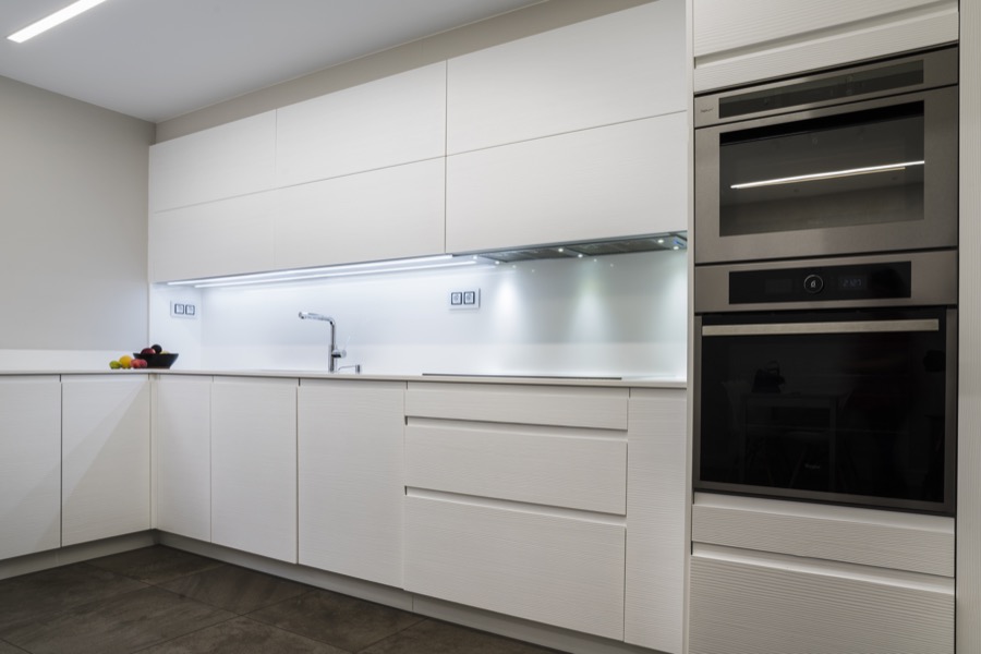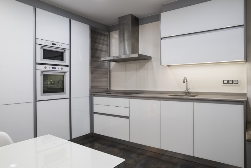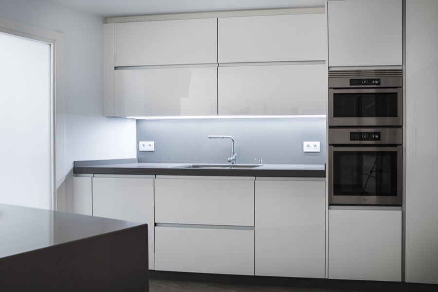 En este modelo de cocina lacada con uñero integrado, conseguimos una cocina de aspecto lineal en acabado blanco mate, consiguiendo un ambiente moderno y acogedor.