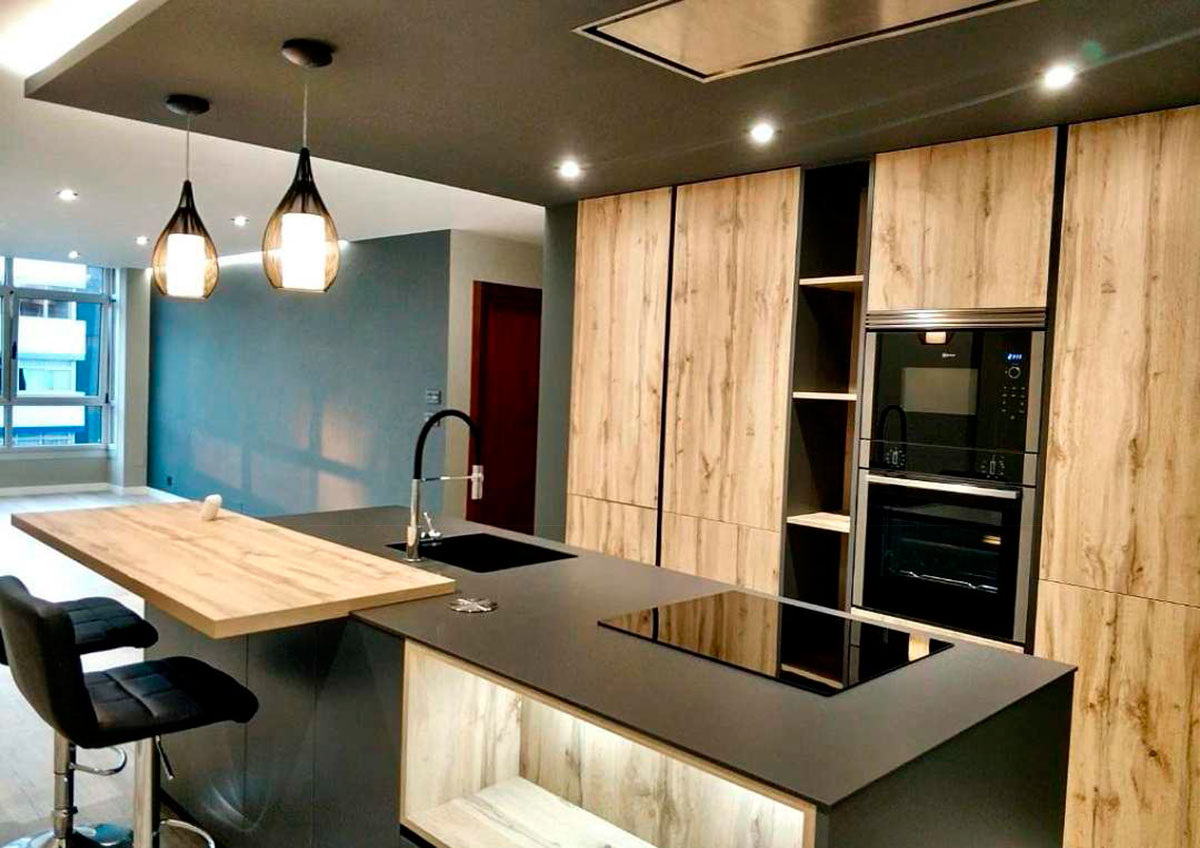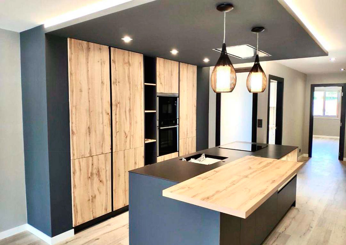 En este modelo de cocina lacada con uñero integrado, conseguimos una cocina de aspecto lineal en acabado negro y blanco mate, haciendo una combinación con madera, consiguiendo un ambiente moderno y acogedor.