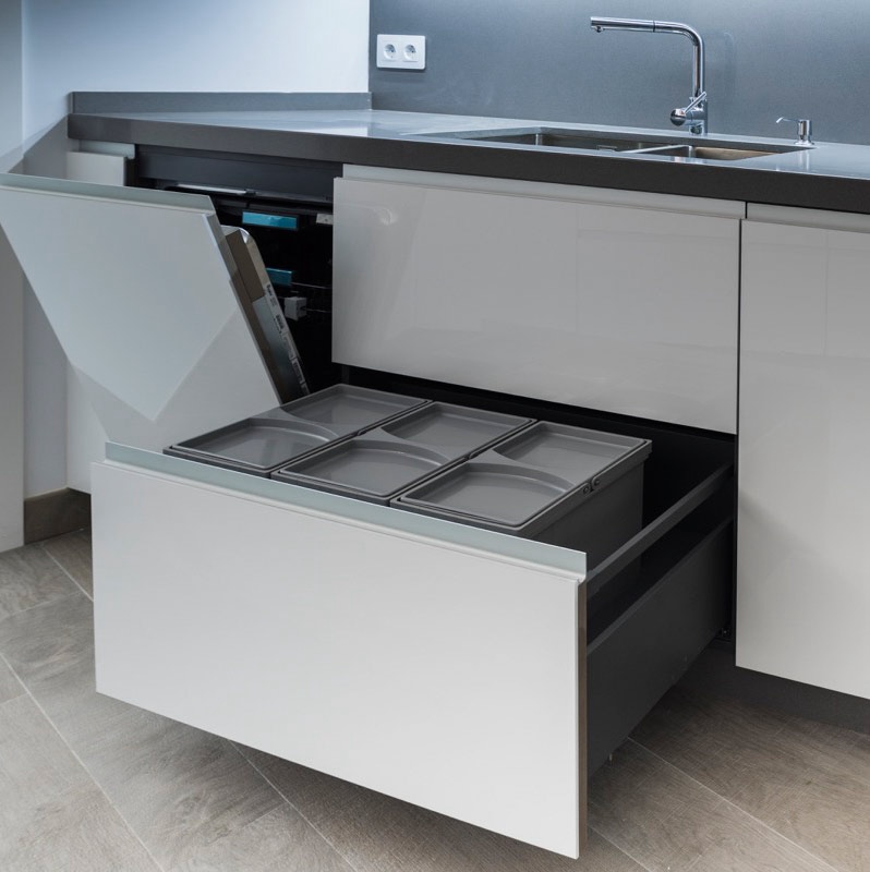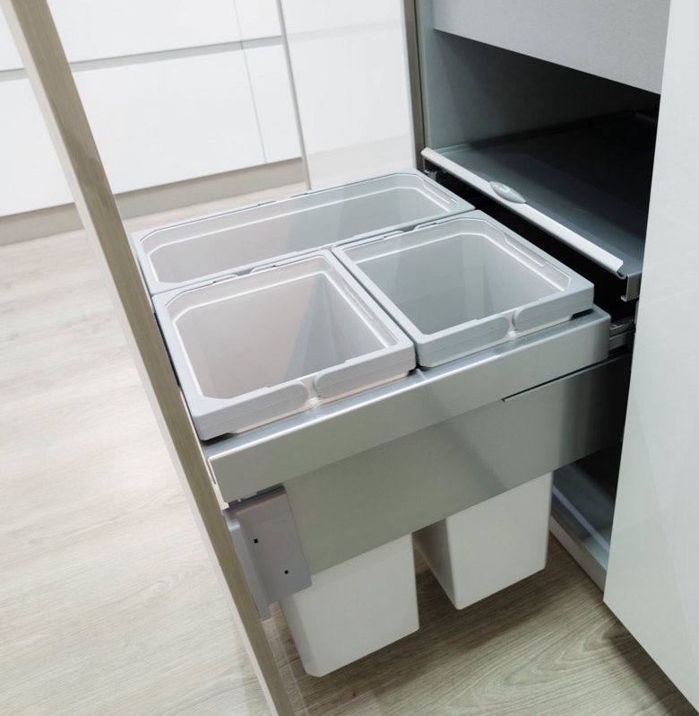Para este apartado disponemos de diversos sistemas de reciclaje, dependiendo de la distribución de la cocina, ya sea con una o con dos gavetas.